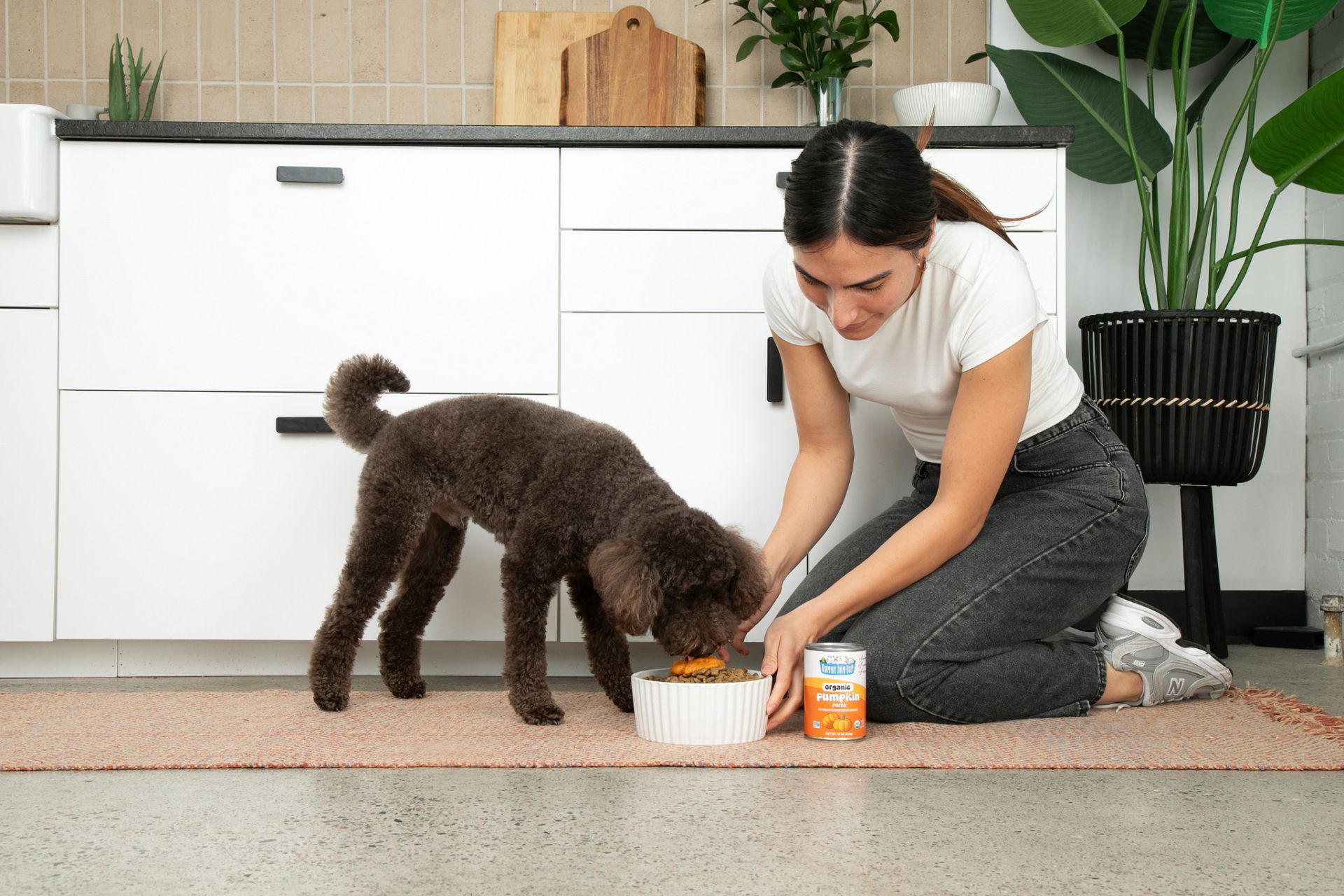 Nummy Tum-Tum is an organic pet supplement, not pet food. Your pet should continue eating their current diet. Nummy Tum-Tum supplements this diet by providing additional dietary fiber, vitamins, and nutrients.