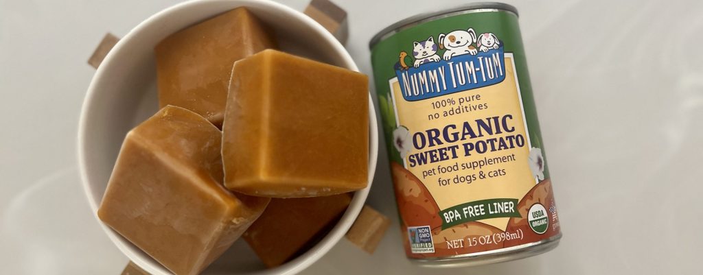 • Frozen pumpkin or sweet potato puree: Dogs and cats love the taste, so you don’t even have to do anything to get them to eat frozen pumpkin or sweet potato cubes. Just throw them in a popsicle mold or ice cube tray and serve them straight to your pet. This can get messy if they take it out of the bowl! Giving your pet frozen treats can help lower their core temperature by cooling them from the inside out. You don’t want to give them anything with added sugar or xylitol. Our purees are 100% pure pumpkin and sweet potato with nothing added, ever.